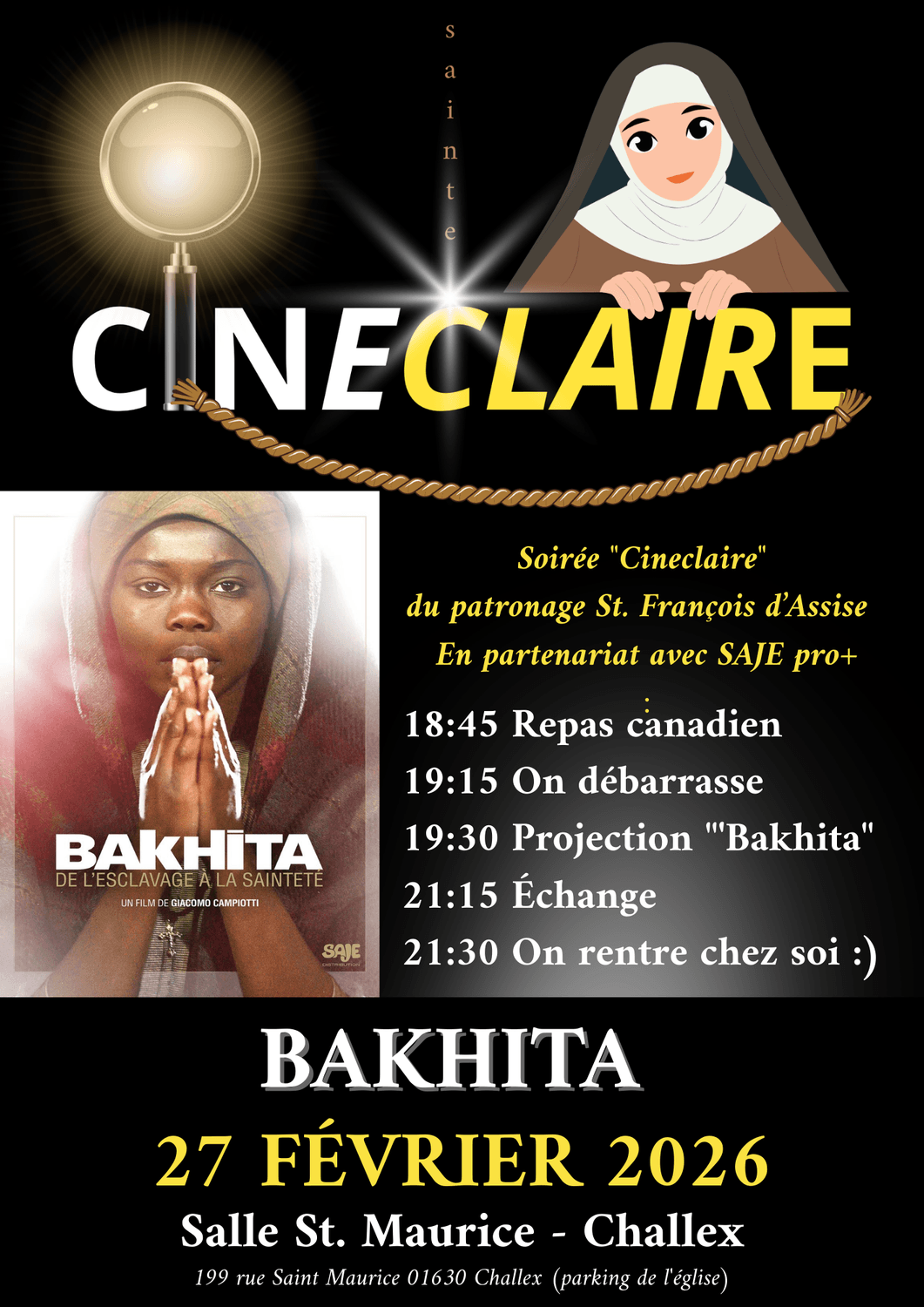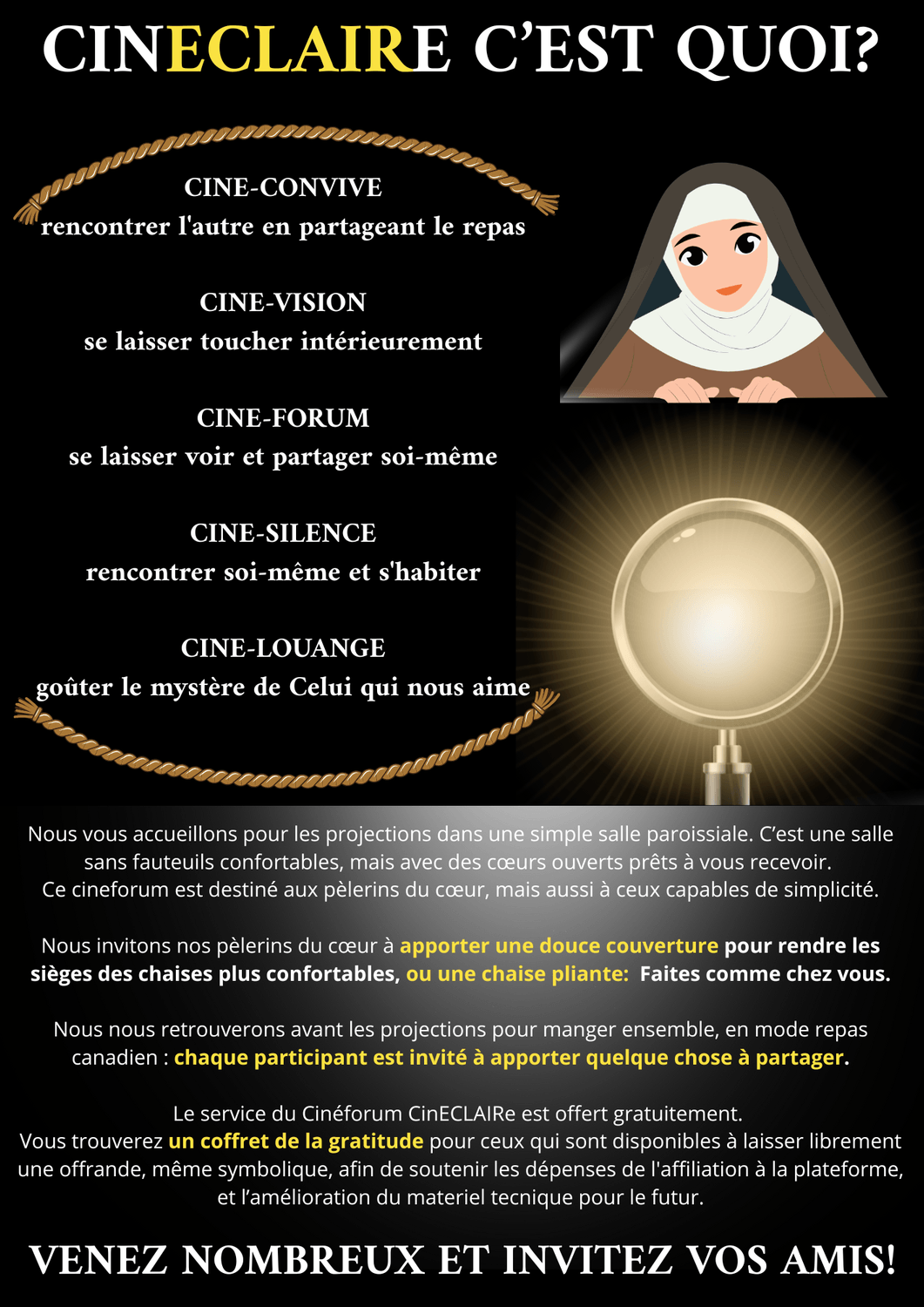 Le Cinéforum né au sein du Patronage Saint-François d’Assise ne pouvait avoir un nom plus beau que celui-ci. La mission du Patronage, tournée vers l’extérieur, trouve son complément dans la contemplation offerte par le cineforum CinECLAIRe, un lieu de profondeur, d’échange et de contémplation.